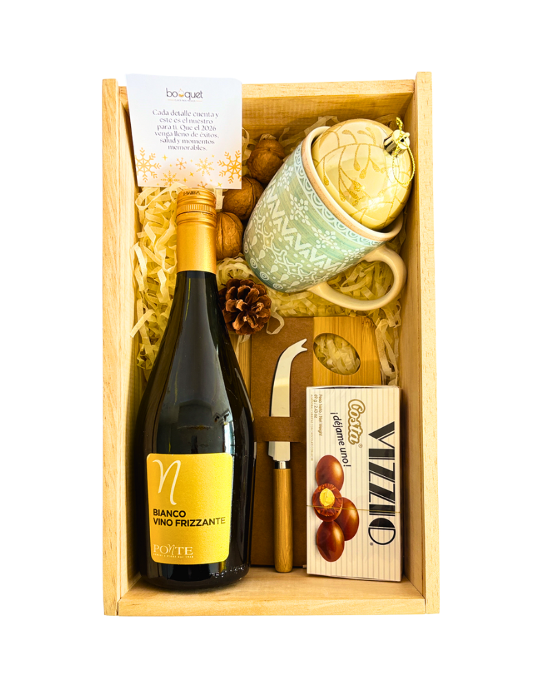 Un detalle navideño elegante y lleno de encanto, diseñado para celebrar la magia de la temporada con estilo. Esta caja premium combina la calidez de la tradición con la exquisitez del buen vino y una selección gourmet pensada para crear momentos memorables. Perfecta para quienes buscan un regalo auténtico, refinado y lleno de buen gusto.